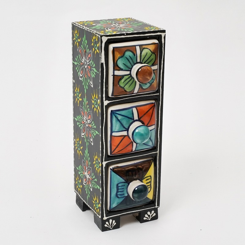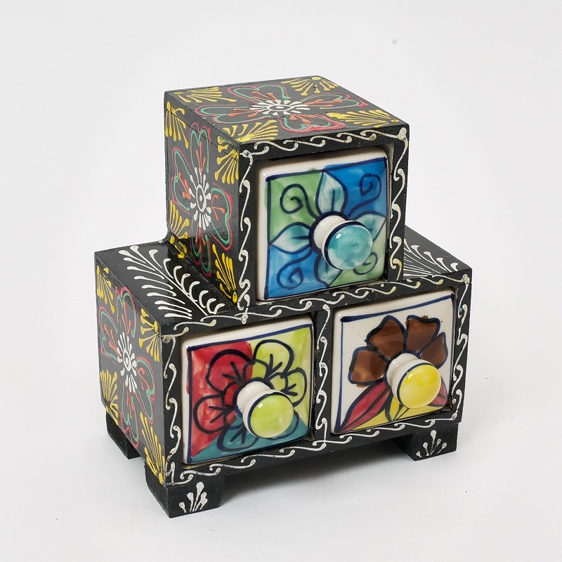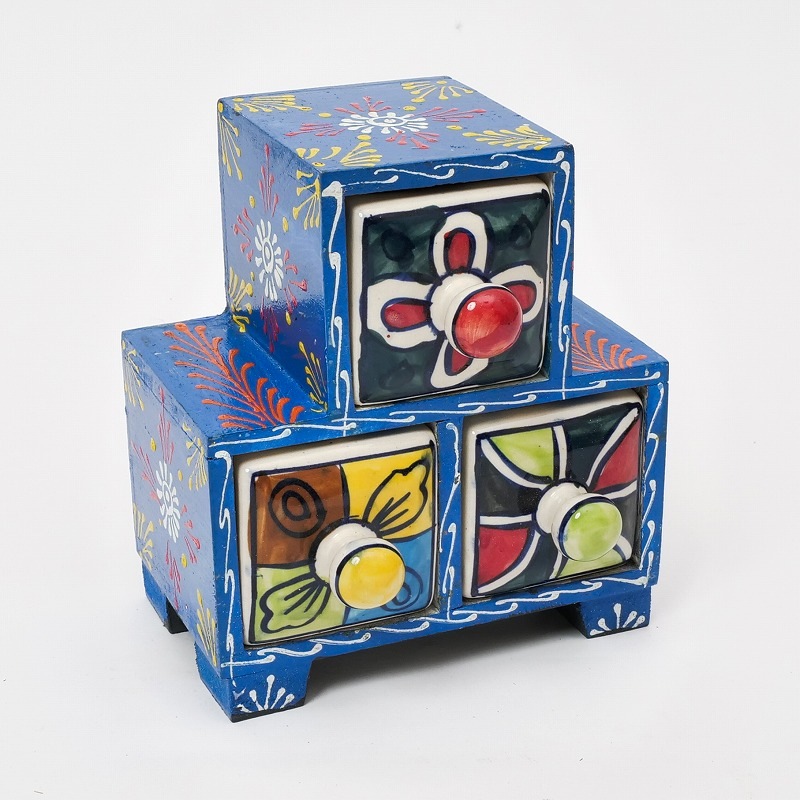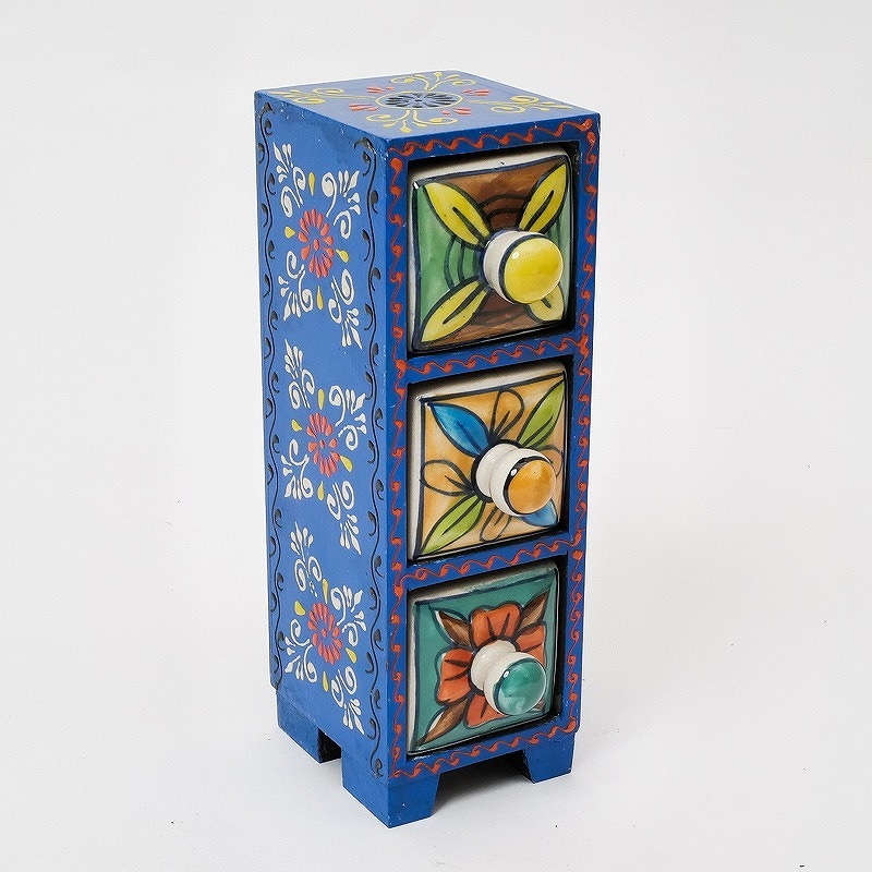 ブルーポタリとメヘンディペイントを掛け合わせたポップなキャビネット。アクセサリーやマスキングテープの整理にぴったりのミニサイズです。玄関先やリビングの小物入れとして。生き生きと描かれた模様が印象的。