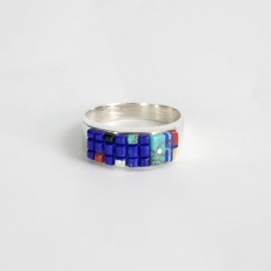 ウィルバートマニングのインレイワークリングです。とうもろこしの少女と呼ばれるコーンメイデンのデザイン。コーンロウと呼ばれる一つ一つの石を立体的に削った細かいインレイワークはラピスラズリベースで涼しげな仕立て。通常のインディアンジュエリーとは一線を画す存在感で、細身ながら主張するリングです。
