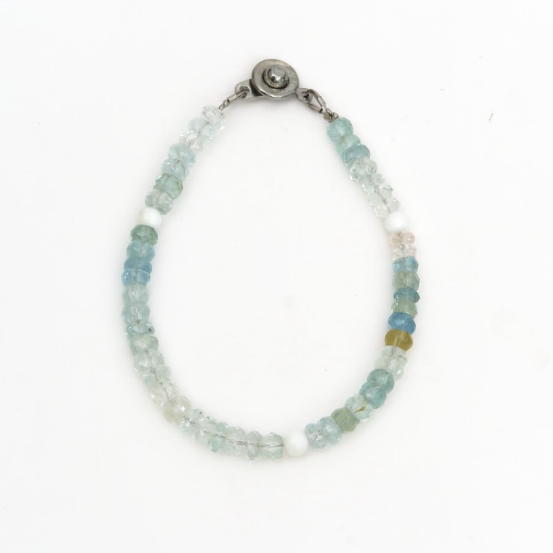 透明感が美しいボタンカットのアクアマリン、イエローベリル、クリアベリルをランラムに配置した小粒ブレスレットです。ホワイトシェルビーズをアクセントで組み合わせています。