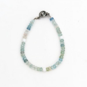 透明感が美しいボタンカットのアクアマリン、イエローベリル、クリアベリルをランラムに配置した小粒ブレスレットです。ホワイトシェルビーズをアクセントで組み合わせています。