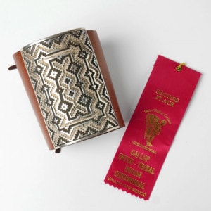 ダンジャクソンのラグオーバーレイボウガードです。トップを一面ラグオーバーレイの大きなプレートで豪華に飾っています。2014年のギャラップセレモニアルエキシビジョンで2位を取った作品で、受賞リボンもついた特別なもの。ボウガードは弓の減の跳ね返りで怪我しないための籠手のこと。現代では伝統衣装の一環として儀式・正装で身につけられています。特別なジュエリーをお探しの方に。