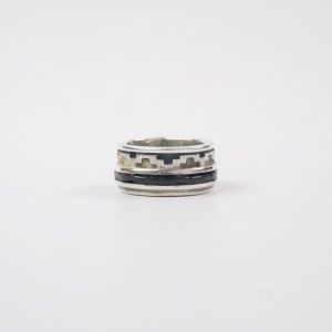 ダンジャクソンのラグオーバーレイリングです。半面はラグオーバーレイ、もう半面にブラックジェットのヒシビーズを嵌めこんだユニークピース、且つ裏面にもラグオーバーレイという大変手のかけられた1点。元々重厚なラグオーバーレイにヒシの立体感が加わり、ナバホの手織りラグの風合いを思わせます。指先に存在感たっぷりのアートピースを。