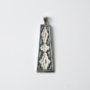 ダンジャクソンのラグオーバーレイペンダントです。ナバホラグをモチーフに糸のこで丁寧にハンドカットされたシルバー、エッジに鏡面のフレームが設けられ、ややフォーマルな仕立てのペンダントです。銀粉とエングレービングでラグの立体感を持たせ、燻し分けとポイントの鏡面磨きで洗練された印象を生み出す。ダンジャクソンだけの、まさにワンオブアカインドなジュエリーです。