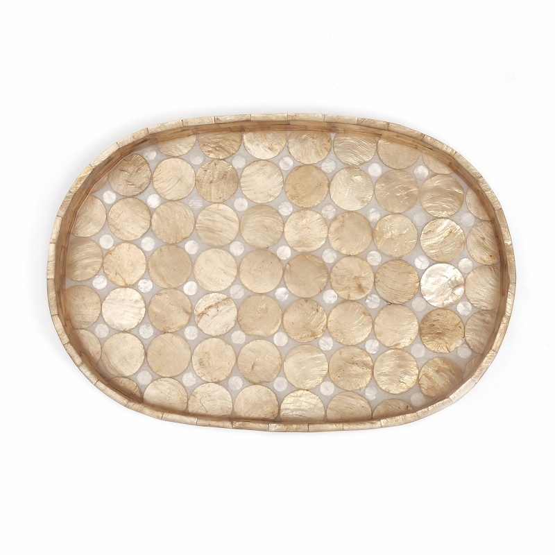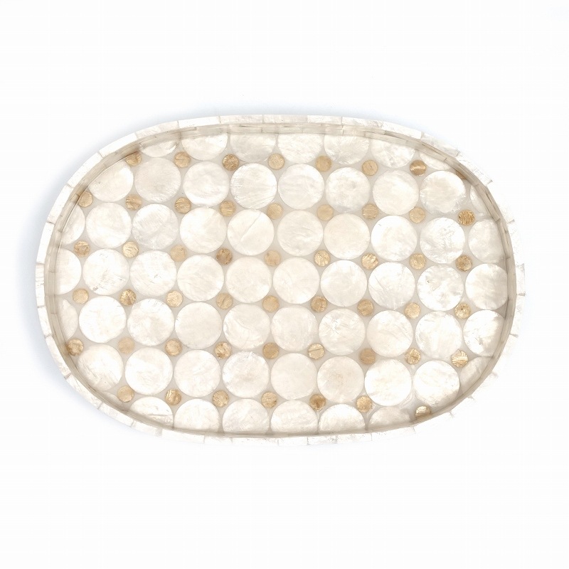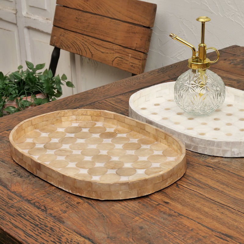 天然のカピスシェルを美しいモザイクタイル状にはめこんだトレイ。大小の色味の違うシェルが並んできらきらと輝きます。インテリアにさりげなく取り入れたいリゾート感溢れるトレイ。ちょっとした来客時に使うお盆としてもちょうどよいサイズ。裏側には黒い滑り止めがついています。