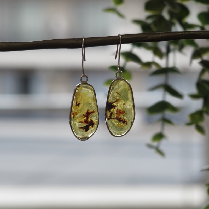 含有物によるマーブルのような模様が太古の昔を思わせる琥珀のピアス。模様や形は一点ごとに異なるため世界に一つの琥珀ピアスです。琥珀の産地はメキシコ・チアパス州。チアパス州の琥珀は2000万年以上前のヒメナエア種の木の樹液より形成されたと言われています。琥珀はメキシコ先住民によってお守りや装飾品として使用されていました。