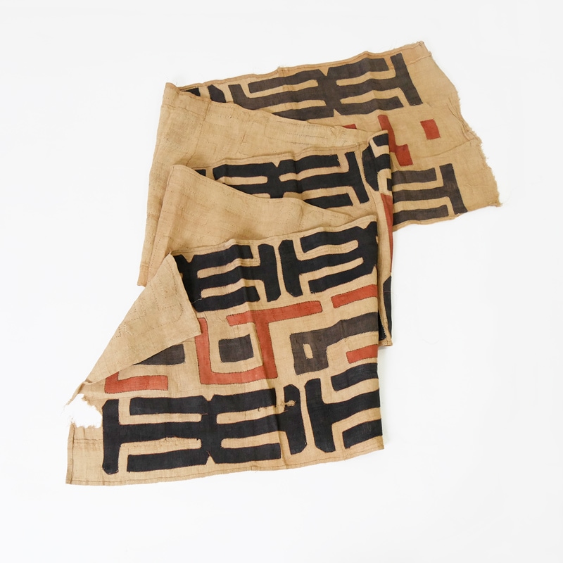 クバ族は王を含むブショング族を中心に約18の民族集団から成り、17世紀に成立した森とサバンナの王国です(現在のコンゴ民主共和国内)。クバ族の居住する地域では綿花が取れない為、伝統的にラフィア椰子の葉の繊維で作られた衣装が作られてきました。それらの衣装は、ブショング族などが作るアップリケや絞り染め、ショワ族の草ビロードなど、それぞれの民族が独自の技法とデザインを発展させ、現在も祭りや儀式の際に身に付けられています。