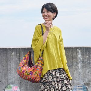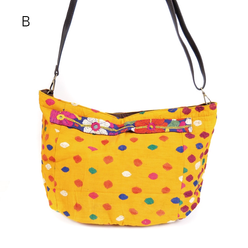 刺繍がたっぷり入った、ラバリ族のオールドスカートから作ったバッグ。鮮やかな刺繍糸からなる細かい模様にミラーワーク装飾などが施され、手しごとの素晴らしさをぎゅっと詰め込んだ1点。普段の荷物が楽々収納できる横長の大きめサイズ、手提げとショルダーの2way仕様。