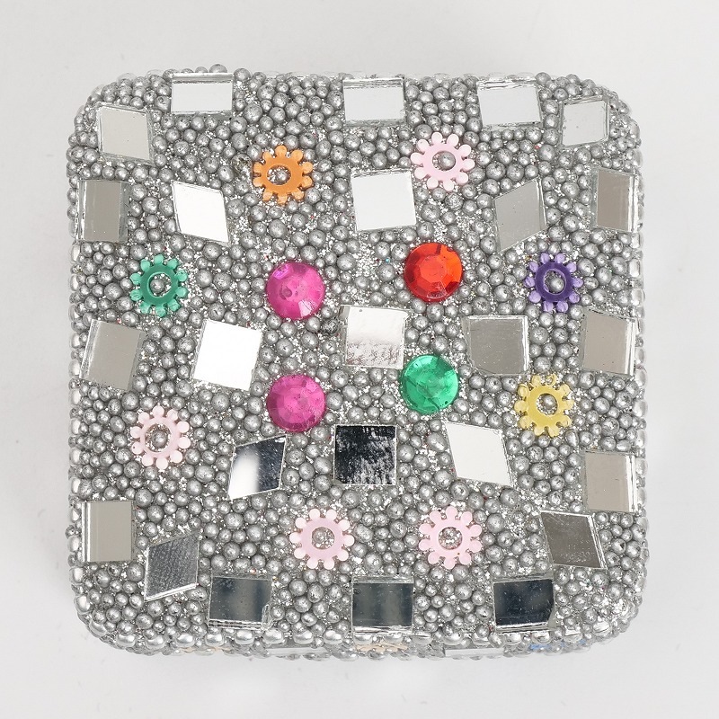インドの伝統的なミラーワークの小物入れ。一面の装飾が豪華で可愛い。アクセサリーを入れたり、ピルケース、リングピローの器としても使えます。