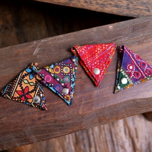 ミラーワーク刺繍は西インドのグジャラート州、「ラバリ族」と南インドのカルナータカ州、「バンジャラ族」が有名です。目差しや視線に宿る力が災いをもたらすと言われ、鏡片には、邪視から身を守る意味があります。また、かわいいものや美しいものに対する嫉妬や妬みから身を守るために、幼児用や花嫁衣装にミラーワーク刺繍が施されることがあります。