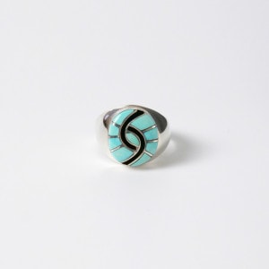 エイミーウェズリーのインレイリングです。ハミングバードやフレンドシップ(友情)と呼ばれるモチーフは、亡き夫であるDickie Quandlacyと共に作っていたデザイン。根強い人気のあるこのモチーフをターコイズのみで小さめトップに仕立てたリングです。現地では男女問わず人気が高い作品です。