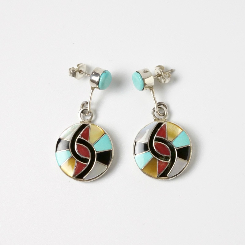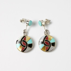 エイミーウェズリー作、フレンドシップのピアスです。こちらは石や貝をカラフルにはめ込んだネイティブ感のあるカラーリング。手と手をつないだようなモチーフであることからフレンドシップ、またはハミングバードと呼ばれるこの幸運を表すモチーフは、ズニ族ジュエリーの伝統柄として受け継がれているものです。大人のカラフルでギフトにも喜ばれそう。