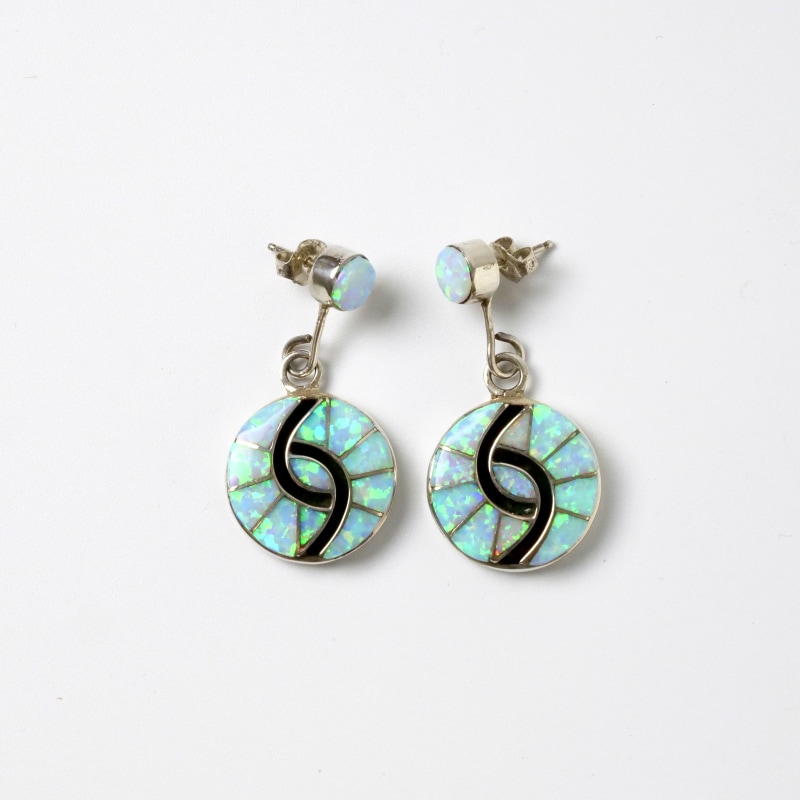 エイミーウェズリー作、フレンドシップのピアスです。こちらは虹色にきらめくシンセティックオパールの1点。手と手をつないだようなモチーフであることからフレンドシップ、またはハミングバードと呼ばれるこの幸運を表すモチーフは、ズニ族ジュエリーの伝統柄として受け継がれているものです。大人のカラフルでギフトにも喜ばれそう。