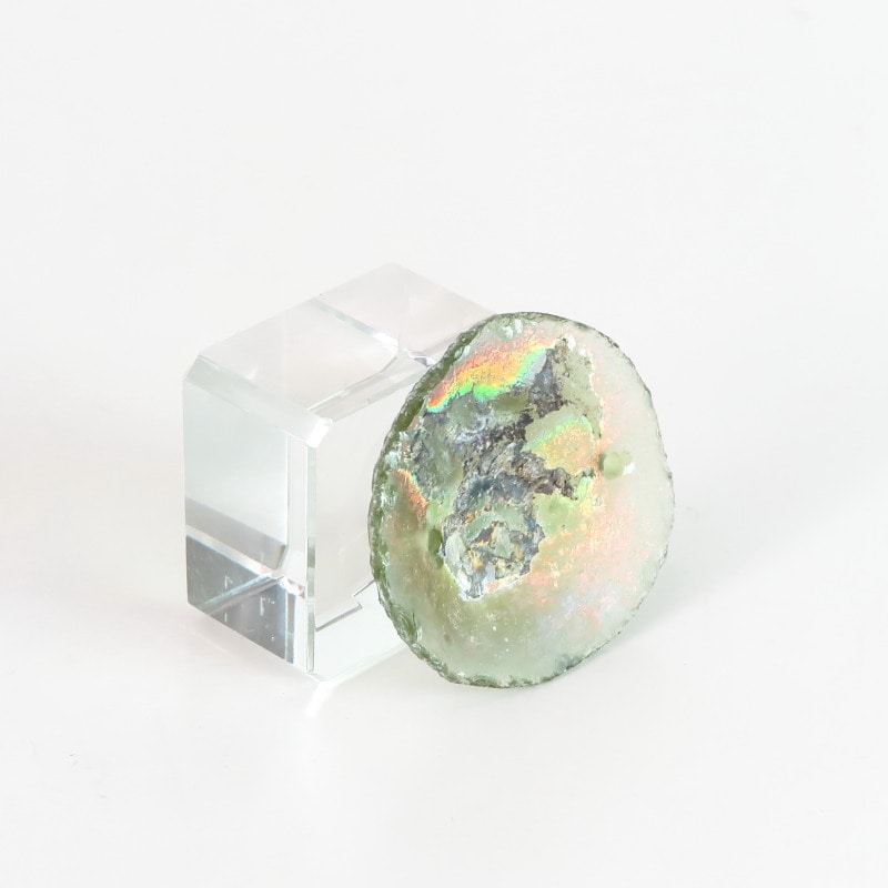 古代ローマングラスの小片です。小瓶などの底面だったと思われる丸型の欠片ですが、ネックレスなどの加工用として、両サイドに新たに開けられた2mmほどの穴が開いています。表面にうっすらと銀化が見受けられます。