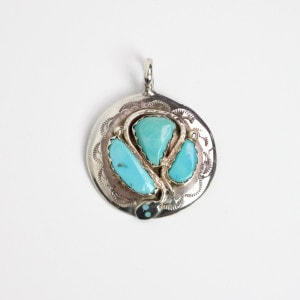 エフィーカラバサ作・スリーピングビューティのスネークペンダントです。3石のターコイズを守るように抱き込んだヘビのキュートな瞳がポイントです。エフィ本人は高齢の為近年はほとんど作品を作っておらず、こちらは当店で10年以上前に入手していた秘蔵品です。