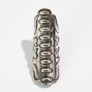 アレックスサンチェスのバンプアウトスタンプを使ったリングです。注目はもちろんこのボリューム!バンプアウトとはオスとメスと呼ばれる凹凸のあるスタンプにシルバーを挟んでデザインを押していくもの。エッジはスタンプにあわせてカットアウトし、鏡面磨きでメタルクラフト感の強いジュエリーに仕立てています。イベントやステージでも注目間違いなしの個性派ジュエリー。
