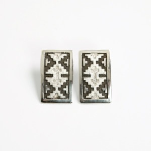 ダンジャクソンのラグオーバーレイピアスです。ナバホラグそのもののようなレクタングル型のプレートピアスで、高級感がありどんなスタイルに合わせやすい作品。ボリュームのわりに重さもあまりなく着けやすいのもポイント。装いのアクセントに。