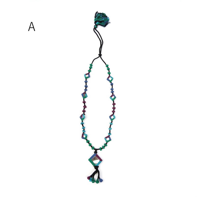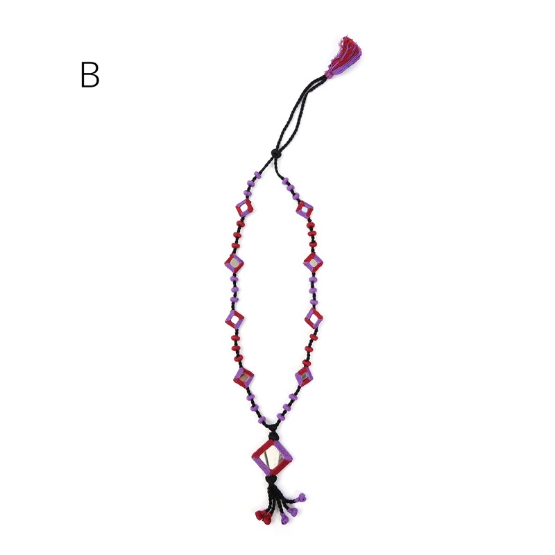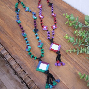 バンジャラ族のミラーワークアクセサリー。ミラーを糸でかがって布に縫い付けるシーシャワークという技法をアレンジしたもの。散りばめられたミラーがアクセントになるネックレス。このアイテム1つでエスニックな雰囲気が出ます。