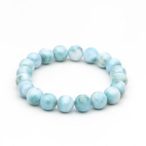 世界三大ヒーリングストーンの一つといわれているラリマーの丸玉ブレスレット。9mm玉を使用したブレスレットです。ライトブルーと白を基調にしたさわやかな色合いです。