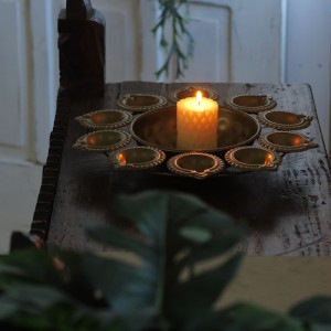 別名「光のフェスティバル」と呼ばれるヒンドゥー教最大のお祭り「ディワリ」でも使用されるトレイ。各家庭で、家の内外に光を灯して神様を祝福し、福を招き入れます。中央にキャンドルや、水を入れて生花を飾り、周りにキャンドルを灯して使うディワリ用のトレイになります。キャンドルホルダーの他、アクセサリートレイなどにお使いいただけます。