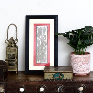 こちらはインドの手工芸品賞の受賞者でもあるAMBIKA DEVIの作品。縦長の画面にまっすぐ伸びるバナナの樹とそこに止まる鳥たちが描かれています。葉の一つ一つが繊細なタッチで描かれており、ポイントに赤が配色されていて上品な雰囲気です。樹脂製のフレームの為、重くなく設置が簡単にできます。