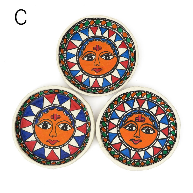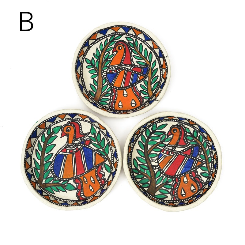 インドのミティラー地方で伝統的に作られる紙粘土細工(ペーパーマッシュ)のトレイ。ほのぼのとした素朴な雰囲気で、手作業で作られる民芸品の温かさが伝わってきます。軽くて扱いやすく、小物入れやウォールデコレーションにも良さそうです。