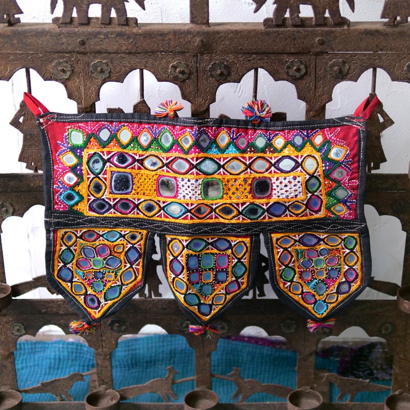 インド、グジャラード州カッチ県のブジやマンドビに居住する「モチ」という人々によって作られたもの。「トーラン」と呼ばれる布で、家の入口の壁などに飾り付けることで幸運を招く縁起物。ミラーワークや刺繍でびっしりと埋め尽くされたとても状態の良い1点。