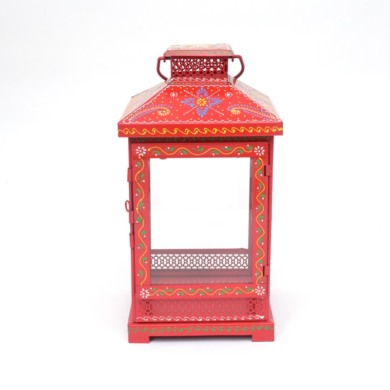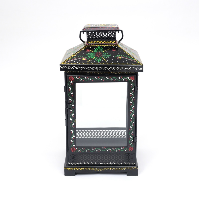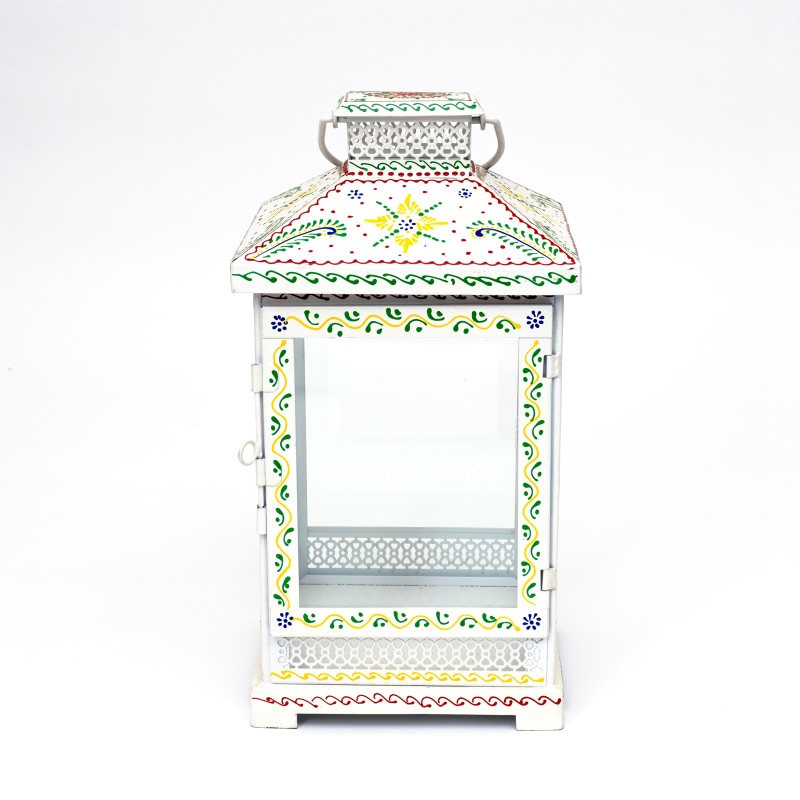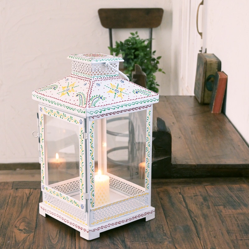 メヘンディとは、お祝い事の時に身体に花や植物を描き、吉祥を招く伝統文化のことで、悪いものから身を守ってくれたり、幸運を呼ぶ力があると言われています。こちらは大きなサイズのキャンドルランタン。金属の部分に細かくメヘンディペイントが施されています。ガラス製で重量があるので倒れにくく、キャンドルを複数入れても余裕があります。キャンドル以外に観葉植物などを入れても良さそうです。