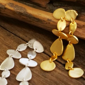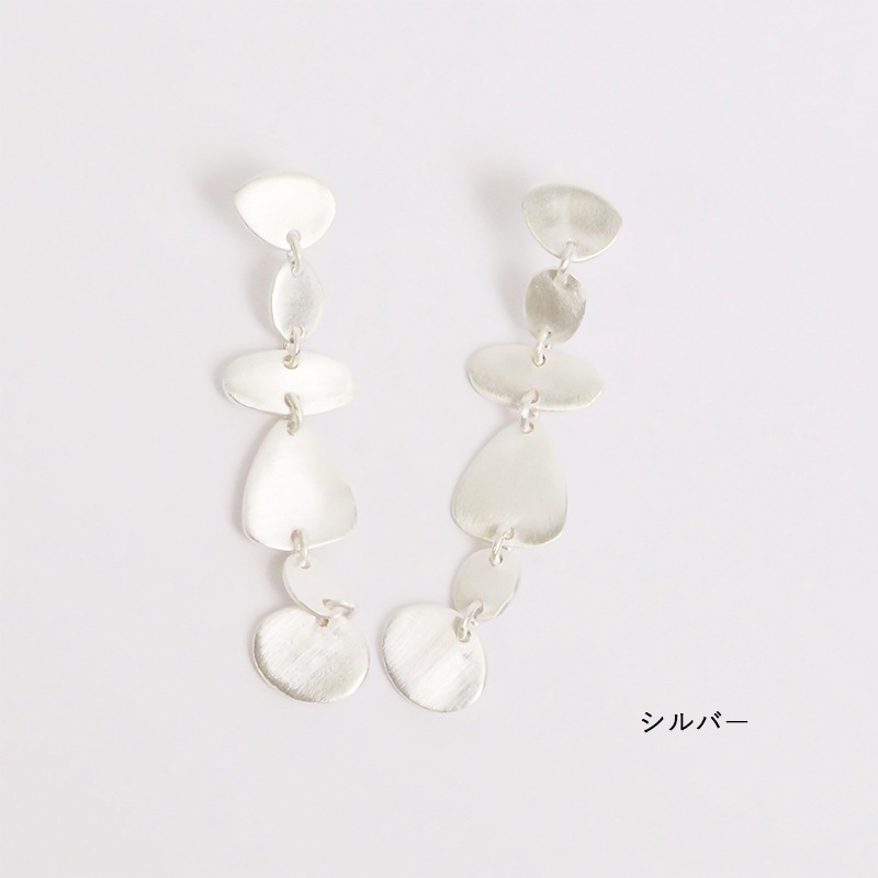 長めの耳元で揺れるデザイン。マット加工で主張しすぎない。