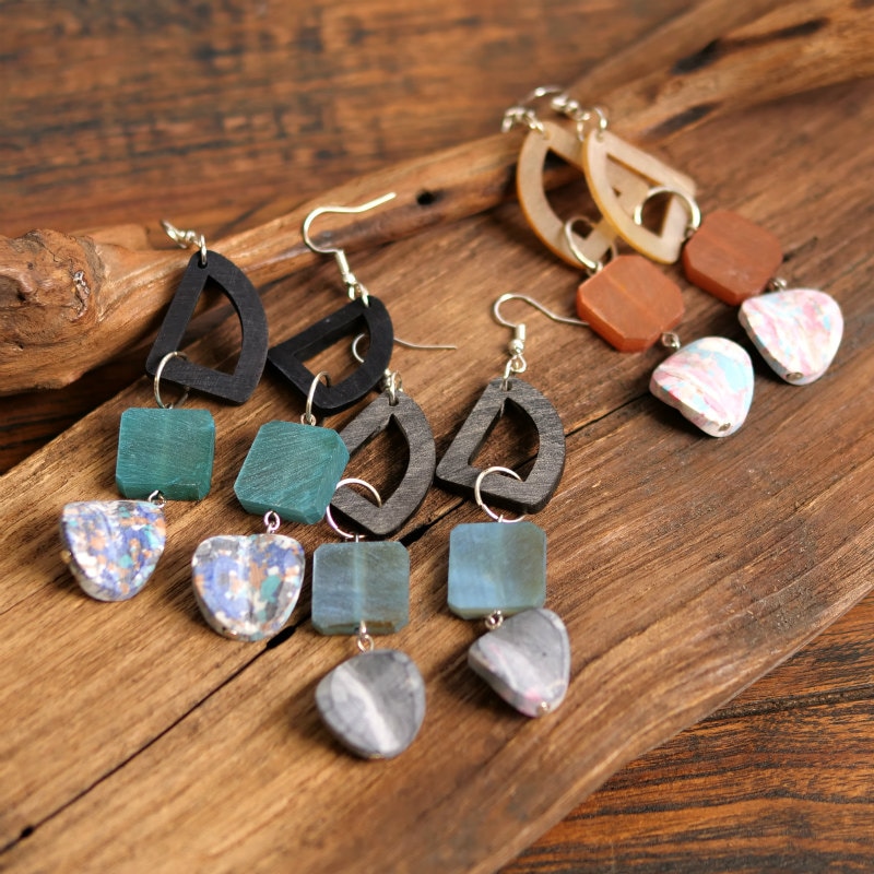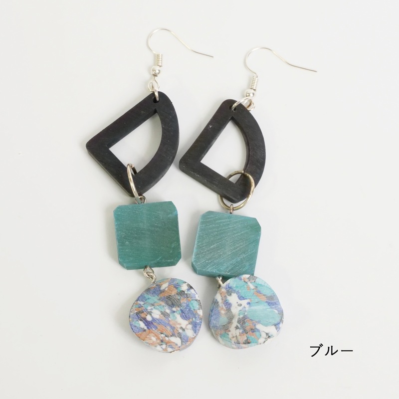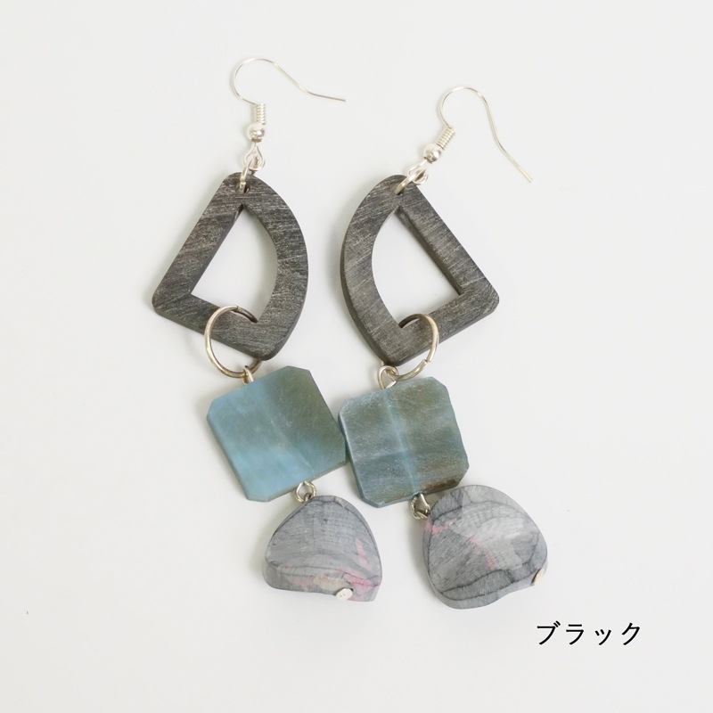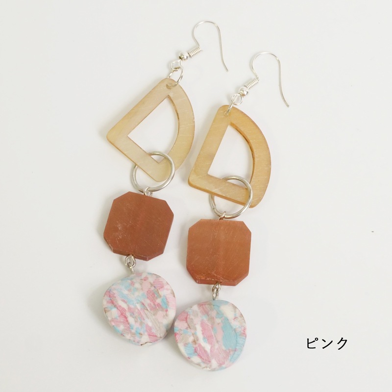 レジン、ホーンの異素材が混在するピアス。揺れる大ぶりなデザインが目を惹きます。主張し過ぎない色合いで取り入れやすい。