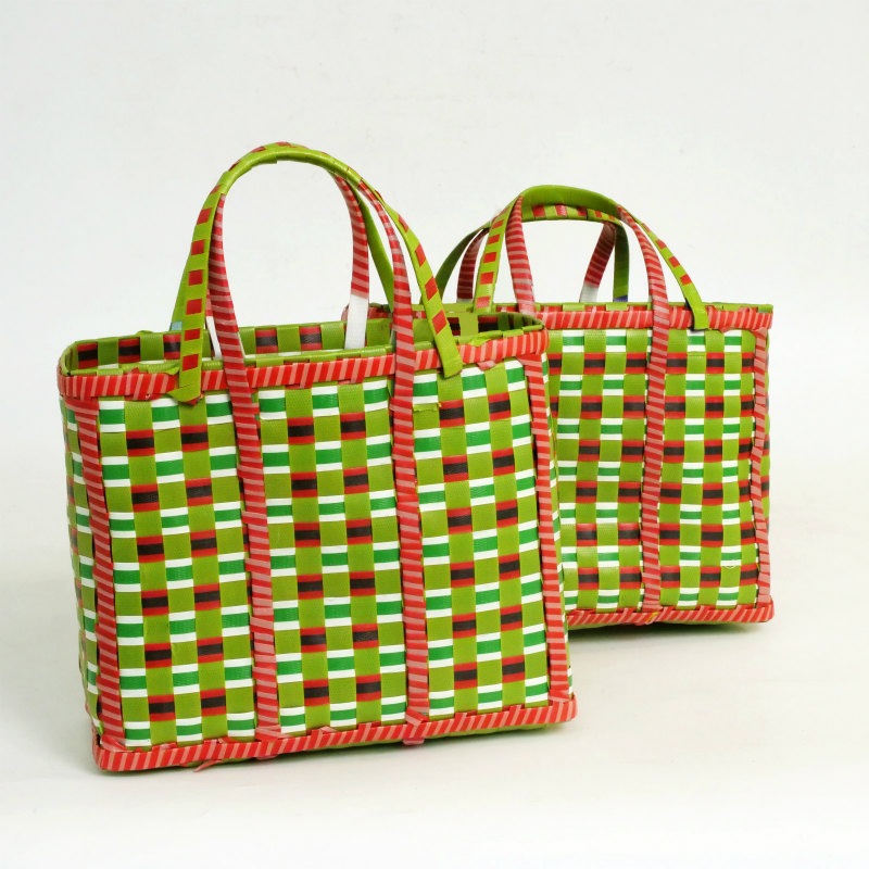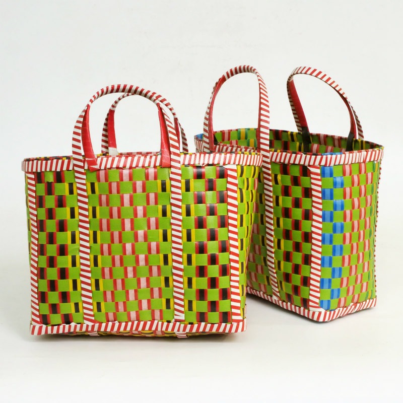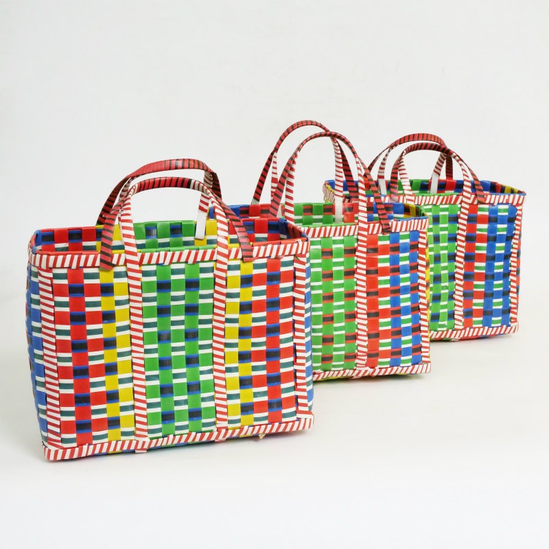 様々なポリプロピレンテープを組み合わせて作られたカラフルなバスケット。雑誌がすっぽり入る大きさで、マチもあるから大容量。丈夫な作りで汚れても水で洗い流せるなど魅力たっぷりのアイテム。インドのローカルマーケットの商品でお母さんたちが一つ一つ手作業で作っています。