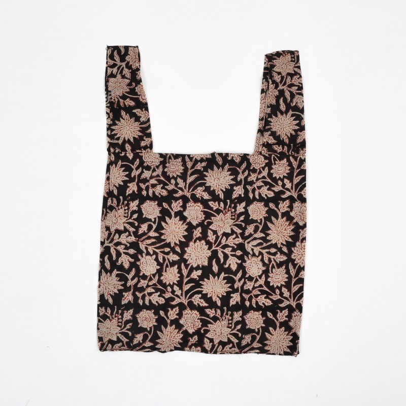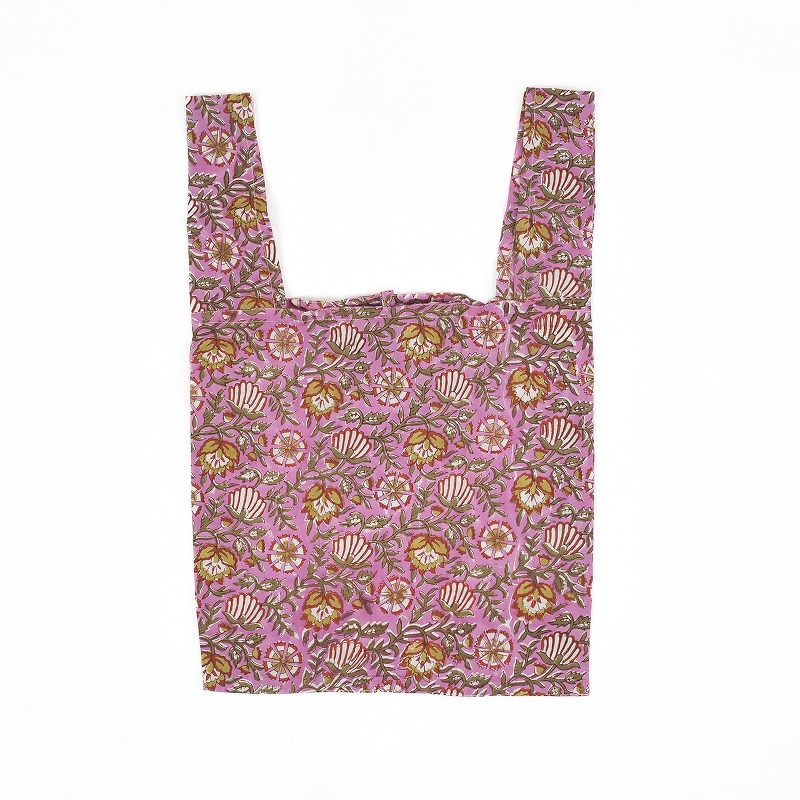 薄手のブロックプリント生地の折り畳みエコバッグ。コットン100%で肌触り抜群、優しい雰囲気の草花模様にぴったり。お出掛けバッグに忍ばせておけば安心。小さめサイズのエコバッグは1つ持っておくと便利です。