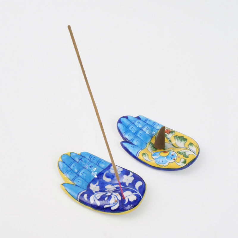ジャイプール伝統の陶器ブルーポタリーの香皿です。ブルーポタリーの柄は植物柄の伝統的なものとなっています。スティック・コーンタイプ両方お楽しみいただけます。