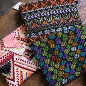 幾何学模様や大胆なカラーのジャガード生地を使ったサコッシュバッグ。お財布や携帯、ポーチなど普段持ち歩く荷物が楽々入るサイズ感。