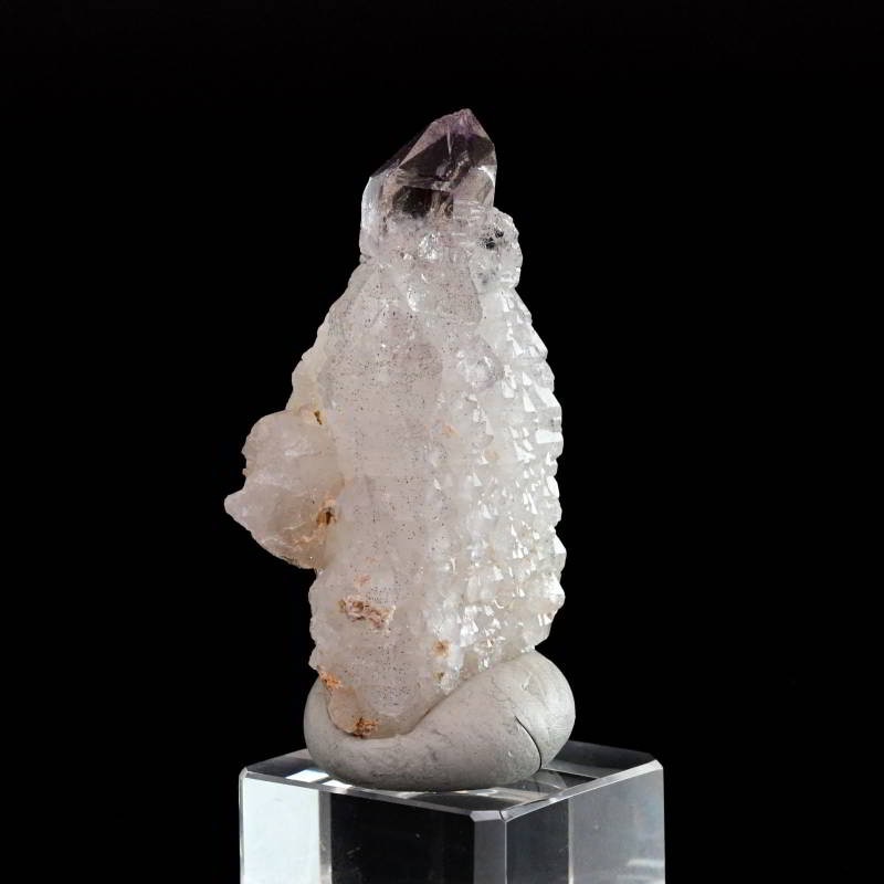 マダガスカル・アンディラムナ産のアメジスト標本。小さいサイズながらもユニークで美しい多様な結晶形状で産出することで知られています。こちらは美しいカテドラル状のクォーツ結晶の上に、小さなアメジストの結晶が成長した、リバースセプター型の珍しい標本です。