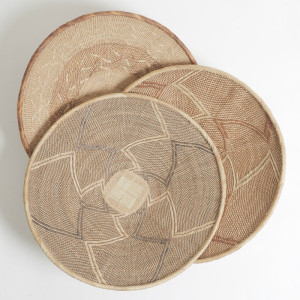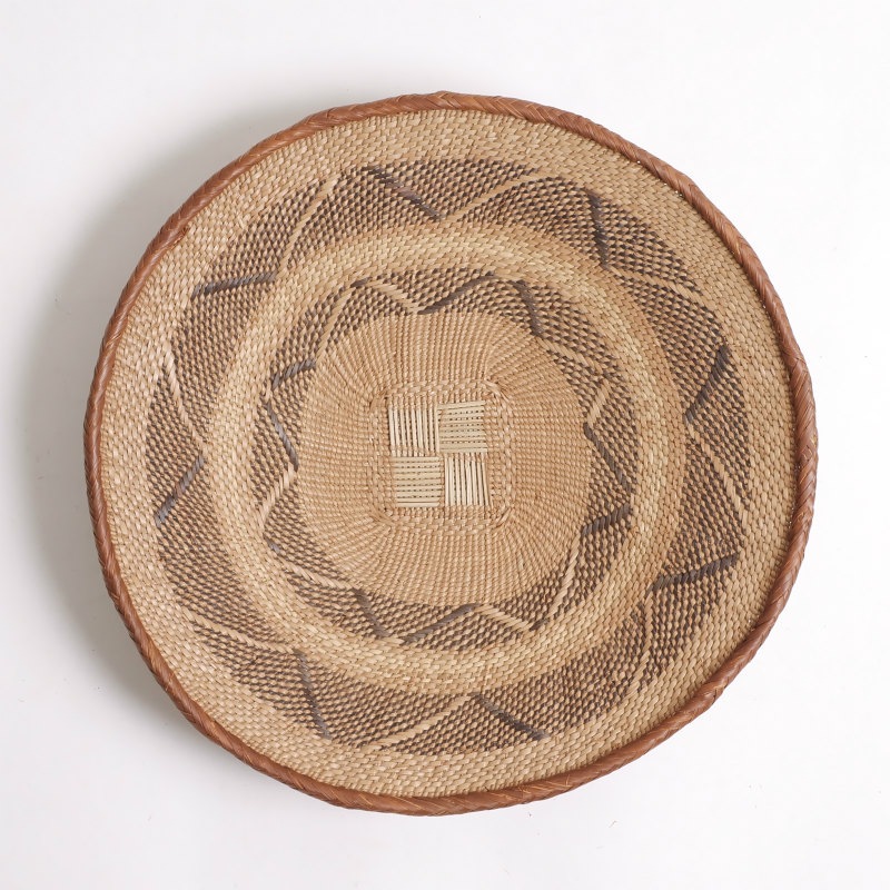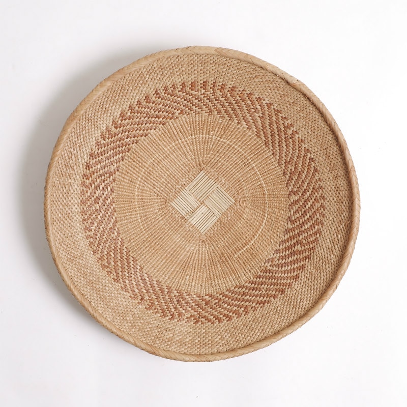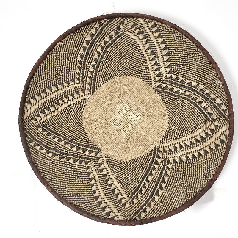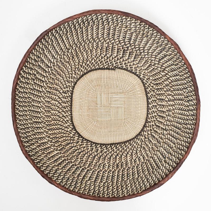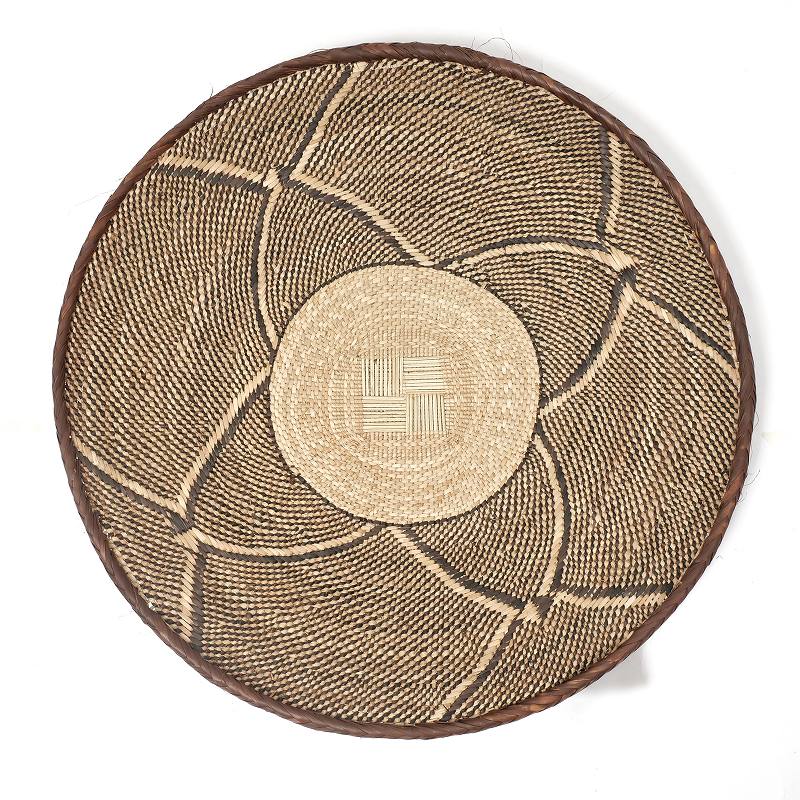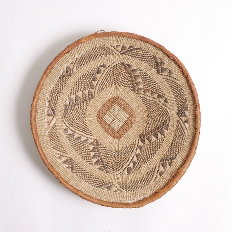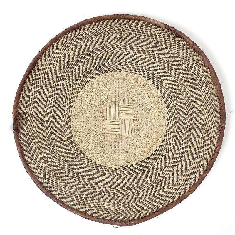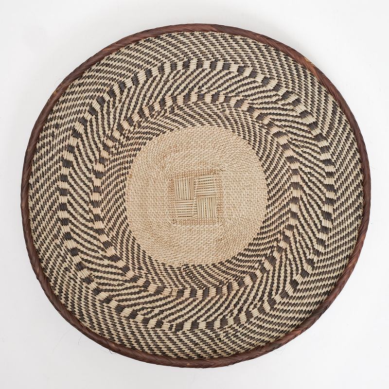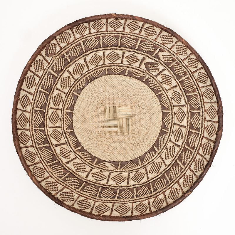 トンガバスケットはイララといわれるパームヤシで編まれるのでイララ皿とも呼ばれます。トンガ族の女性を中心に1点1点手で編まれ、30cmの物を1枚完成させるのに1週間以上かかるそう。模様には木の皮や根などから取られる天然染料が使われます。伝統的にトウモロコシなどの穀物を運ぶのに使われてきたものですが、現在では家計を担う女性の手仕事として貴重な収入源にもなっています。バスケットとしての利用はもちろん、壁にかけてインテリアのアクセントにするスタイルも人気です。