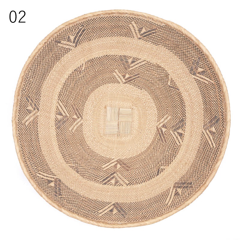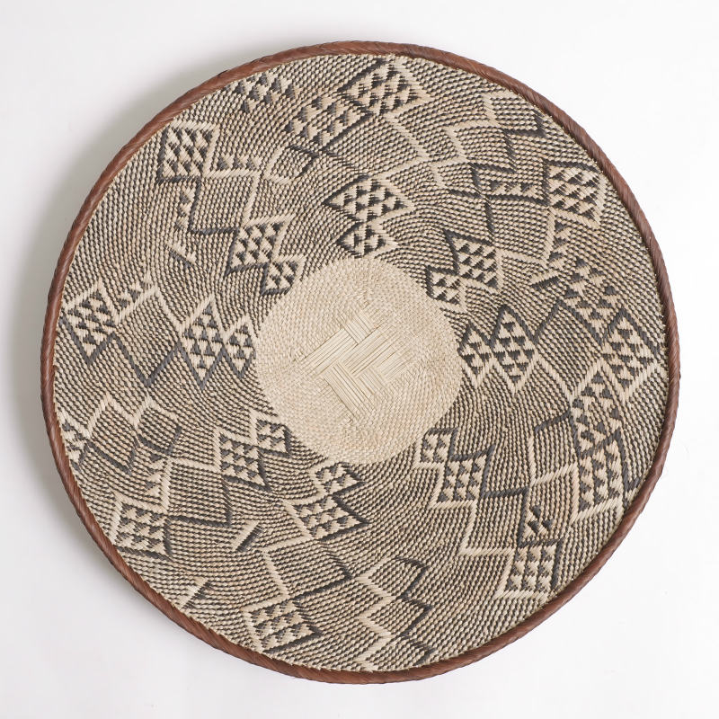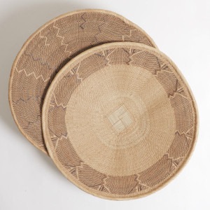 トンガバスケットはイララといわれるパームヤシで編まれるのでイララ皿とも呼ばれます。トンガ族の女性を中心に1点1点手で編まれ、30cmの物を1枚完成させるのに1週間以上かかるそう。模様には木の皮や根などから取られる天然染料が使われます。伝統的にトウモロコシなどの穀物を運ぶのに使われてきたものですが、現在では家計を担う女性の手仕事として貴重な収入源にもなっています。バスケットとしての利用はもちろん、壁にかけてインテリアのアクセントにするスタイルも人気です。