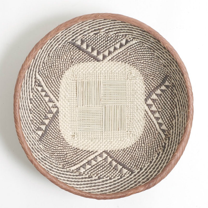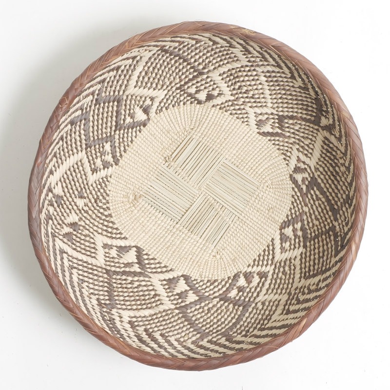 トンガバスケットはイララといわれるパームヤシで編まれるのでイララ皿とも呼ばれます。トンガ族の女性を中心に1点1点手で編まれ、30cmの物を1枚完成させるのに1週間以上かかるそう。模様には木の皮や根などから取られる天然染料が使われます。伝統的にトウモロコシなどの穀物を運ぶのに使われてきたものですが、現在では家計を担う女性の手仕事として貴重な収入源にもなっています。インテリアのアクセントとしてお使いいただけます。