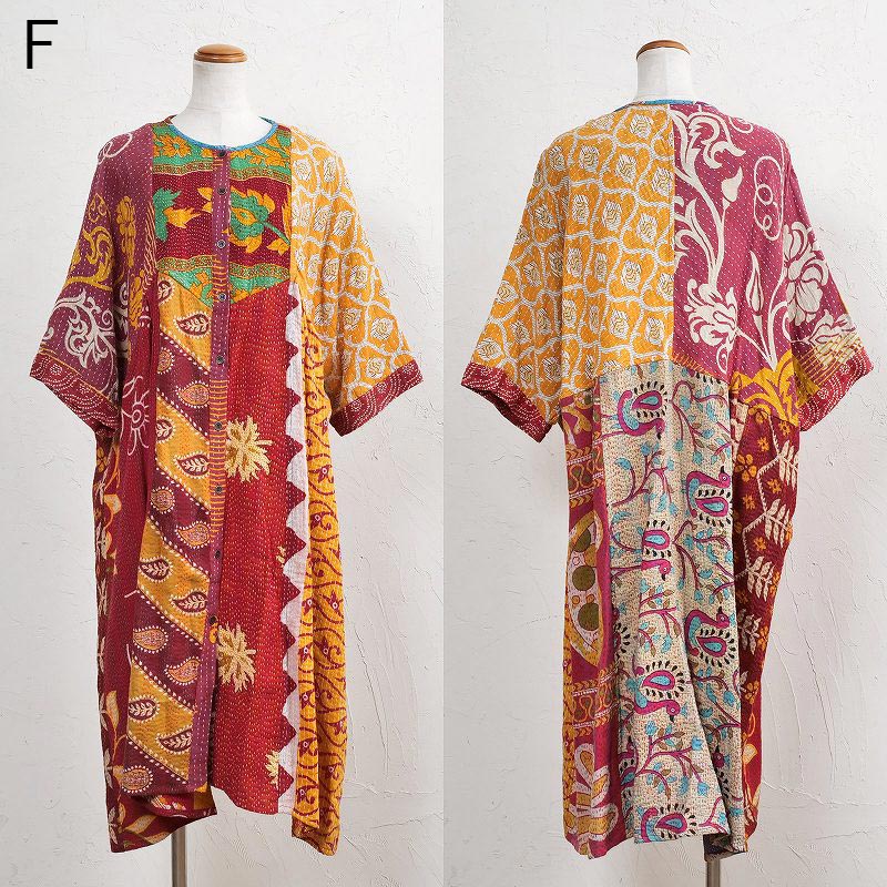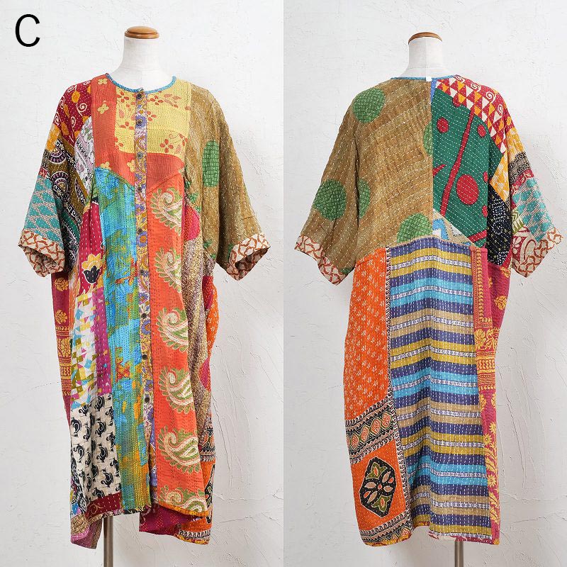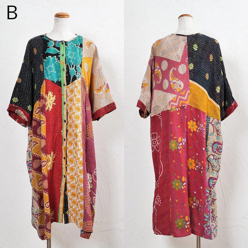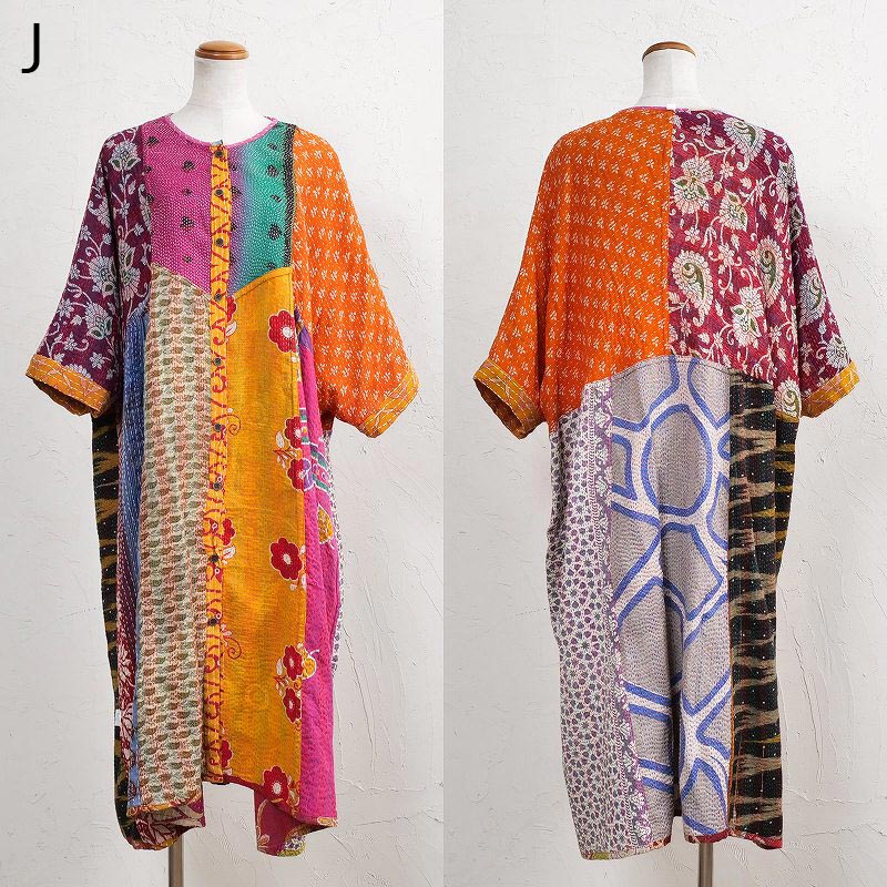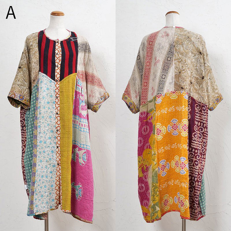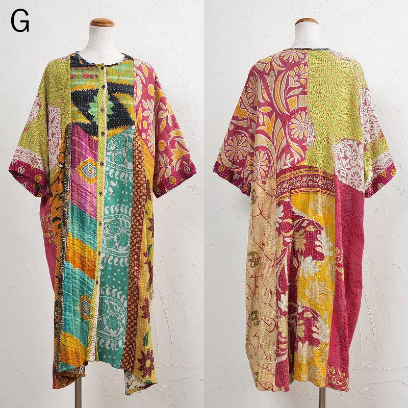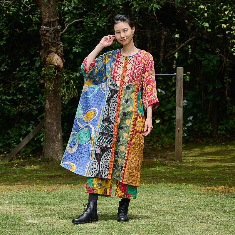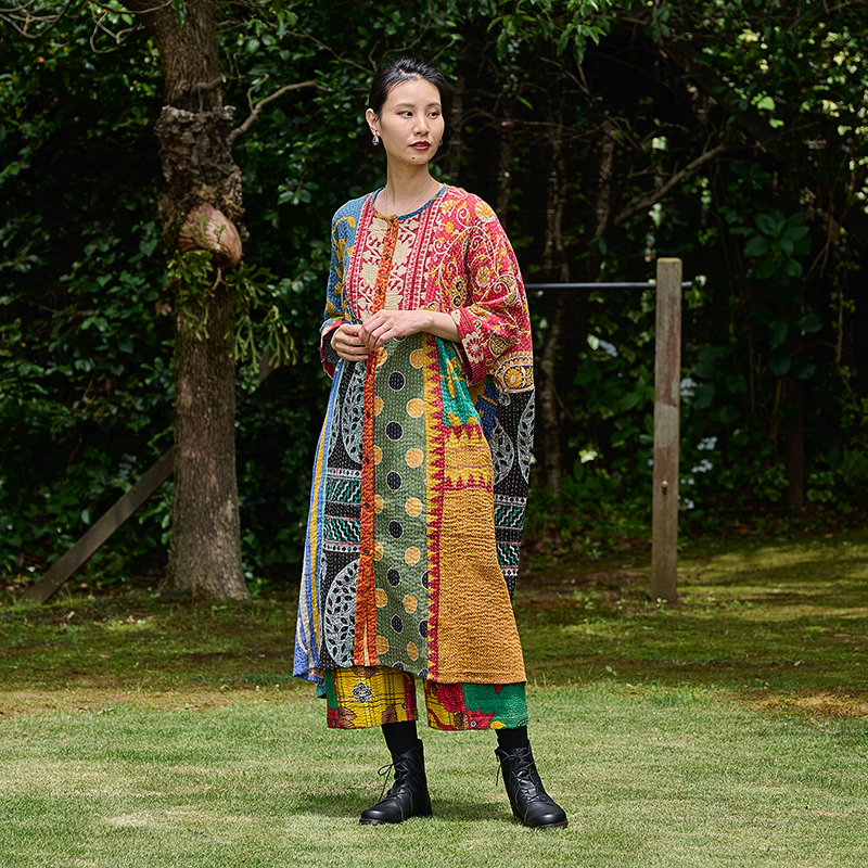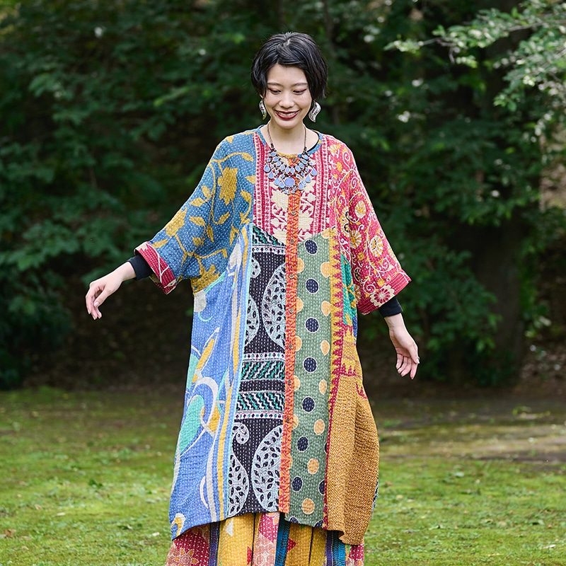 様々な色合いの生地をパッチワークして、色鮮やかで華やかに仕上げたロングコート。七分袖で季節の変わり目に着こなすこともでき、ロングシーズン着られるアイテム。リバーシブルで着ることができ、たっぷりとしたラインで、中にドルマンスリーブなど袖回りがゆったりしたアイテムを合わせやすいのもポイント。個性豊かな着こなしが楽しめるシリーズです。