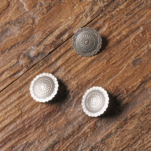 アメリカ・サウスウエストより直輸入、本場のニッケルコンチョです。スタンプワーク風の柄、エッジを花型に仕上げた華のある1点。レザー系の小物に着けても、ヘアアクセにしても、服のアクセントにしても、何をしても映える王道コンンチョです。