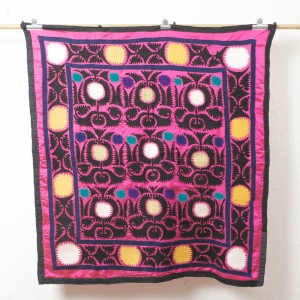 スザンニ(スザニ)は、中央アジアの遊牧民に伝わる刺繍を施した布のことで、ウズベキスタンがその発祥地と言われ、ウズベキスタン、タジキスタン、カザフスタンなどの国々で広く伝わる伝統技法です。ウズベク語で「刺繍」を意味し、その語源はペルシア語で「針」を示す「スザン」に由来すると言われています。刺繍には花や植物をモチーフにしたものが多く、各家庭で作られ、主に壁掛けやベッドカバー、座布団などに使われてきました。長い時間をかけて施されたびっしりと密な刺繍と、それらモチーフの重厚な立体感、中央アジアならではの美しい配色や繊細なモチーフの配置が魅力です。