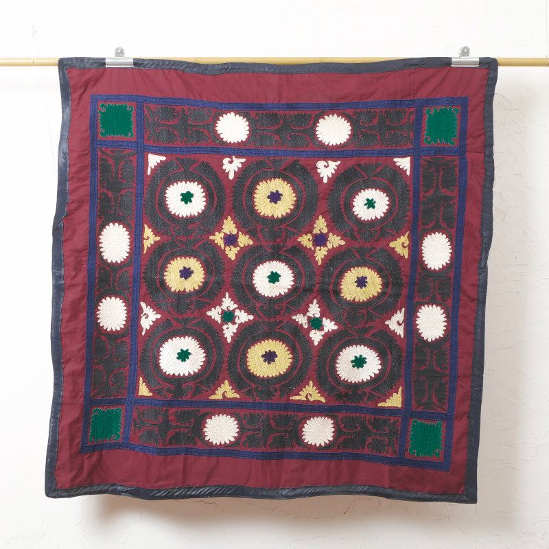 スザンニ(スザニ)は、中央アジアの遊牧民に伝わる刺繍を施した布のことで、ウズベキスタンがその発祥地と言われ、ウズベキスタン、タジキスタン、カザフスタンなどの国々で広く伝わる伝統技法です。ウズベク語で「刺繍」を意味し、その語源はペルシア語で「針」を示す「スザン」に由来すると言われています。刺繍には花や植物をモチーフにしたものが多く、各家庭で作られ、主に壁掛けやベッドカバー、座布団などに使われてきました。長い時間をかけて施されたびっしりと密な刺繍と、それらモチーフの重厚な立体感、中央アジアならではの美しい配色や繊細なモチーフの配置が魅力です。