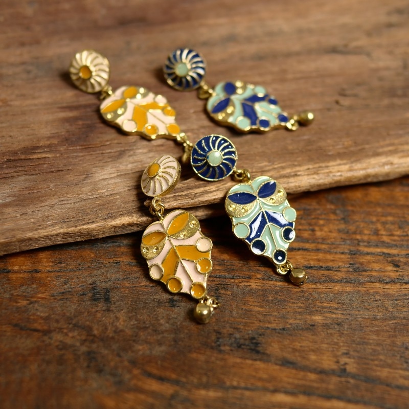 ミナカリ細工のリーフピアス。珍しいデザインのリーフなのでコーデのアクセントになりそう!ミナカリとはブラスやメタルなどの土台に、エナメルを焼き付けてつくられる七宝焼きのこと。この技法は、ペルシャなどから伝わったため、唐草などのペルシャの文様がアレンジされたものが多く見られます。