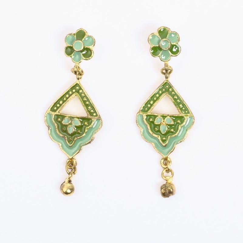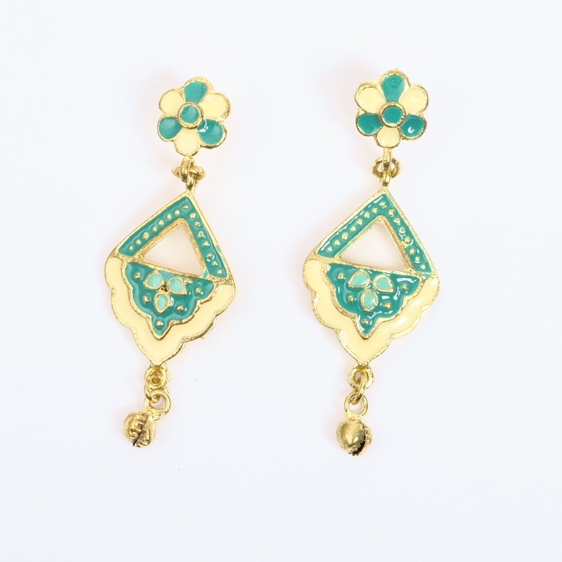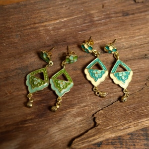 ミナカリ細工のオリエンタルピアス。エスニック色が強めのデザイン。ミナカリとはブラスやメタルなどの土台に、エナメルを焼き付けてつくられる七宝焼きのこと。この技法は、ペルシャなどから伝わったため、唐草などのペルシャの文様がアレンジされたものが多く見られます。