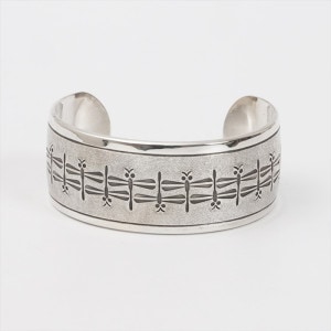 ナターシャペシュラカイのスタンプワークバングルです。水場を教えてくれることから『導き手』とされるトンボの意匠をテクスチャシルバーにぎっしりと敷きつめたユニークなデザイン。両サイドにはアローヘッドのスタンプがありお守りの意味が込められていることがわかります。どことなく和の美学も感じられ、インディアンジュエリーの枠にはまらないペシュラカイジュエリーの魅力を堪能できるバングル。