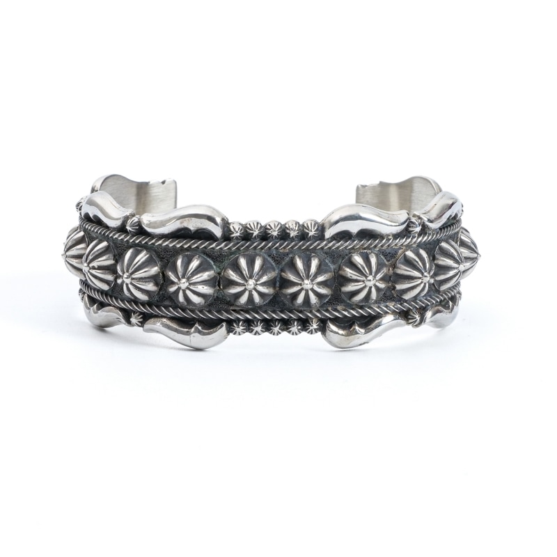トーマスジムのシルバーバングルです。カットアウトしたバンプアウトパーツやドロップを銀板に貼り付けるアップリケの手法でふんだんに飾り付けた手の込んだ作品。大きなロゼッタビーズをトップからエンドまで隙間なく配し、エッジには小さいロゼッタと波打つアップリケパーツを丁寧に貼り付け、ベースのシルバーはその曲線に合わせて丁寧にカットアウトされています。ずしりと重厚、古き良きウエスタンを感じさせるノスタルジアに満ちたジュエリー。