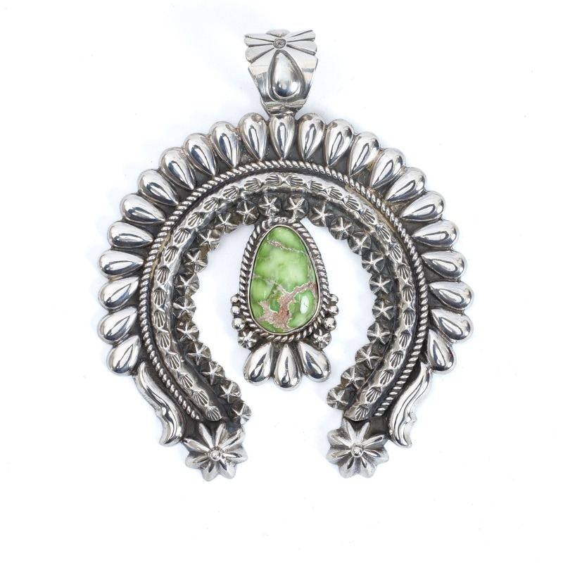 トーマスジムのアパッチブルービッグナジャペンダントです。ひとつひとつのパーツをバンプアウト・カットし貼り付けた、手間暇を惜しまないシルバークラスター細工の大ぶりナジャ。中心には近年では入手困難なアップルグリーンのハイグレードキャリコレイクターコイズがセットされています。これひとつでナジャネックレス級の貫禄が味わえる1点、通すのは長めのチェーンやビーズネックレスがおすすめ。