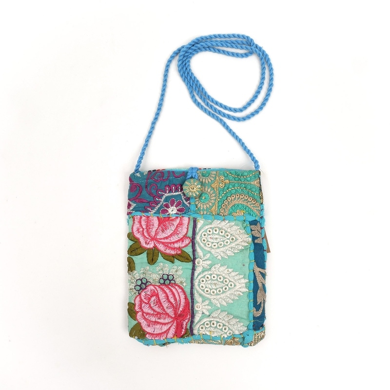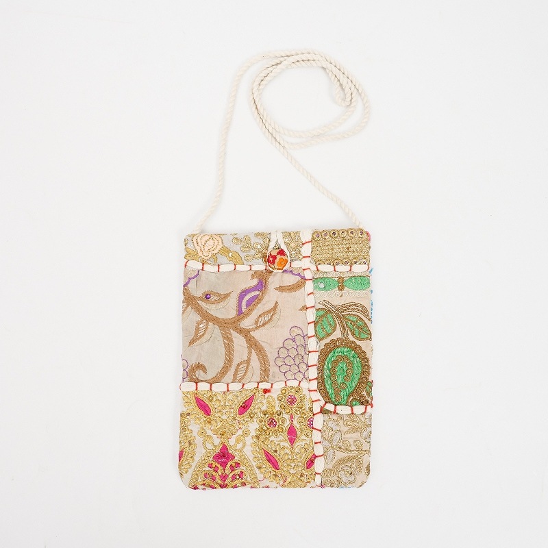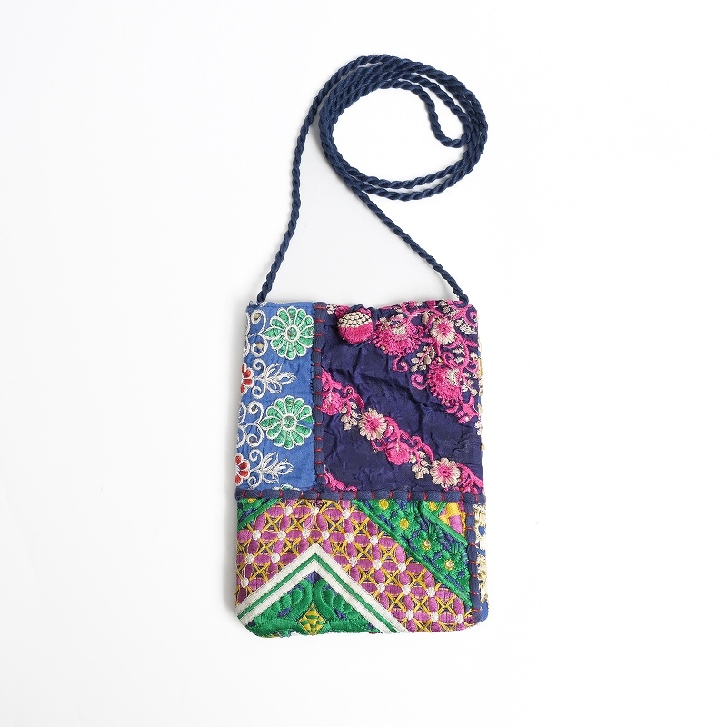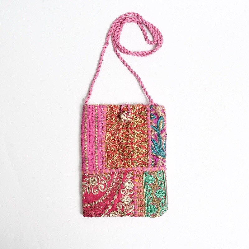 スマホショルダー等にちょうど良いフラットでコンパクトなサイズの縦型ポシェット。刺繍やスパンコールなどが装飾されたオールドドレスの魅力的な部分を集めた「カンバディア」生地がコーディネートのワンポイントになります。刺繍や柄が異なる1点もの。どんな柄が届くかはお楽しみに。