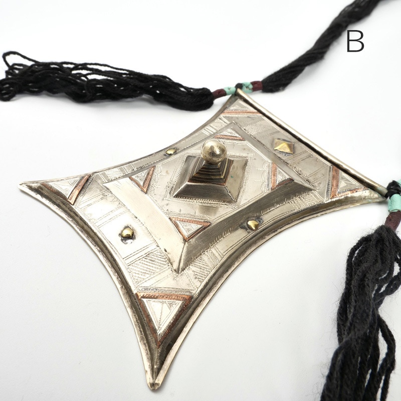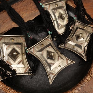 砂漠の民・トゥアレグ族が身に着ける、細かい模様が施された民族色溢れるアクセサリー。災い除けや、幸運を祈願して身につける"Tcherot"(チェロット)と呼ばれるネックレス。中にはコーランの一節を書いた紙や、イスラム教の指導者による護符(タリスマン)、またサハラ砂漠の砂などが入っているといわれています。