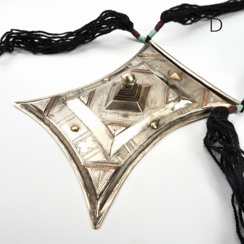 トゥアレグ族は北アフリカのアルジェリア、ニジェール、マリなどに暮らすベルベル人系の遊牧民族です。民族衣装が鮮やかな青色であることや、かつてはキャラバンを襲撃することもある好戦的な民族であったことから「青の民」「砂漠の戦士」とも呼ばれています。中東やアフリカのイスラム世界では珍しく女系社会を形成しており、男性がターバンで顔や体を覆い隠すのに対し、女性には比較的多くの自由が与えられています。トアレグ族のアクセサリーは自分の身分をを示すものや遊牧時の通行手形のような役割として使用されていました。古いものの多くは、親から子に家を示す大切なものとして代々受け継がれています。