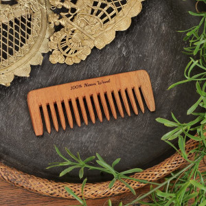 温かみのある質感と手触りのニームウッドで作られた櫛。インド伝統工芸のブロックプリントのケース付き。木櫛は静電気を起こしにくい素材なのでキューティクルが傷みにくく、枝毛や切れ毛を防ぎます。さらに櫛にツバキオイルなどを染み込ませて使用すると、髪の毛に自然な艶を与えます。荒い歯の櫛は手櫛のようにさっくり梳かすことができるため、絡まりやすい髪に適しています。荒い歯の櫛で髪を梳かし、そのあと細かい歯で仕上げをするとよりサラサラな髪に仕上がります。